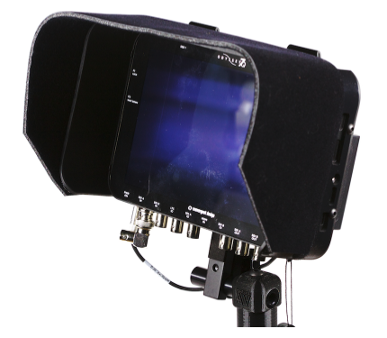 There’s a fold-out anti-glare visor that improves screen visibility when filming outdoors or on bright sets. The visor folds down and seals shut with Velcro when the monitor’s not in use, providing extra protection for the screen during transport.