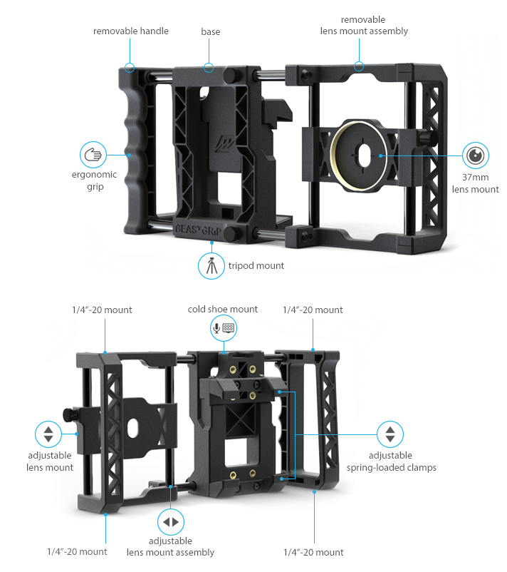 All of the major components of the Beastgrip Pro are custom manufactured. The main body components are manufactured using a mold injection process with an extremely durable glass-filled nylon material. Rubber overmolded clamps will hold your phone securely and protect it from scratches. The custom-machined brass lens mount ring and threaded inserts are molded-in place before the material hardens, forming an unbreakable bond. And the custom-machined anodized aluminum standoffs and aluminum thumb screws with a soft nylon tip assure a smooth operation and increased durability. All products will be fully assembled by hand in the USA.