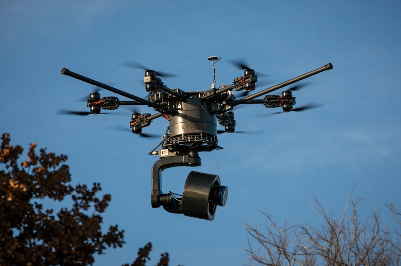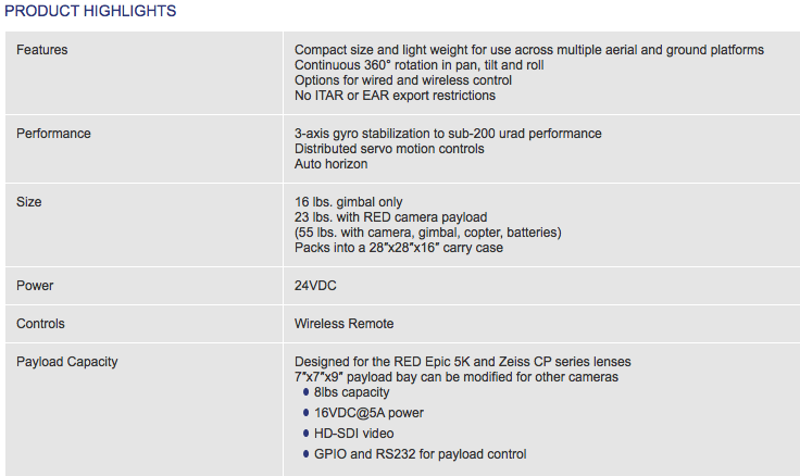 The DaVinci marries AES’ industry-leading stabilized gimbal with the RED Epic Dragon 19 megapixel camera to provide customers with highest resolution available in an FAA-compliant unmanned aerial system. This camera system can be operated wirelessly while mounted on rotary-wing aircraft or vehicle to provide super-HD imagery. Previously unachievable shots will now be available to cinematographers. The DaVinci gimbal weighs 15 lb. (6.8kg), or 23 lb. (10.4kg) with the RED camera integrated. There are a number of different zoom lens options available. The gimbal features continuous 360° rotation in pan, tilt and roll and options for wired and wireless control.