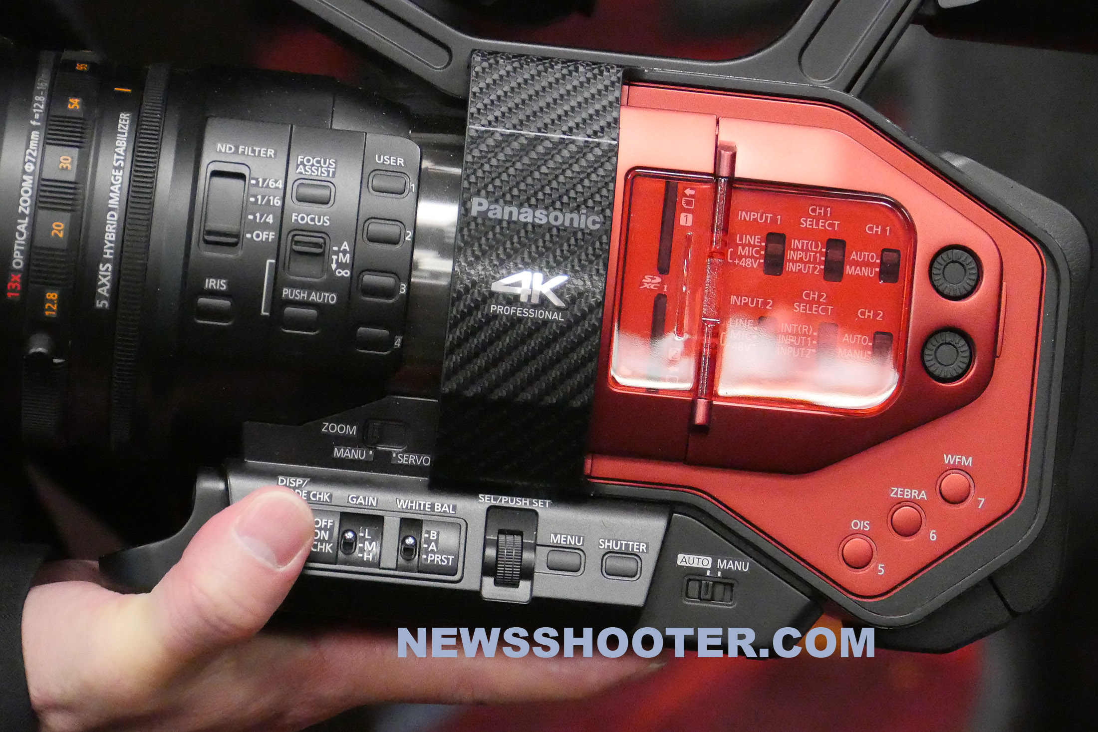 The prototype they showed at the announcement has red accents with carbon-fiber patterns on parts of the camera. It has a full complement of controls on the operator side of the camera along with outputs on the offside.