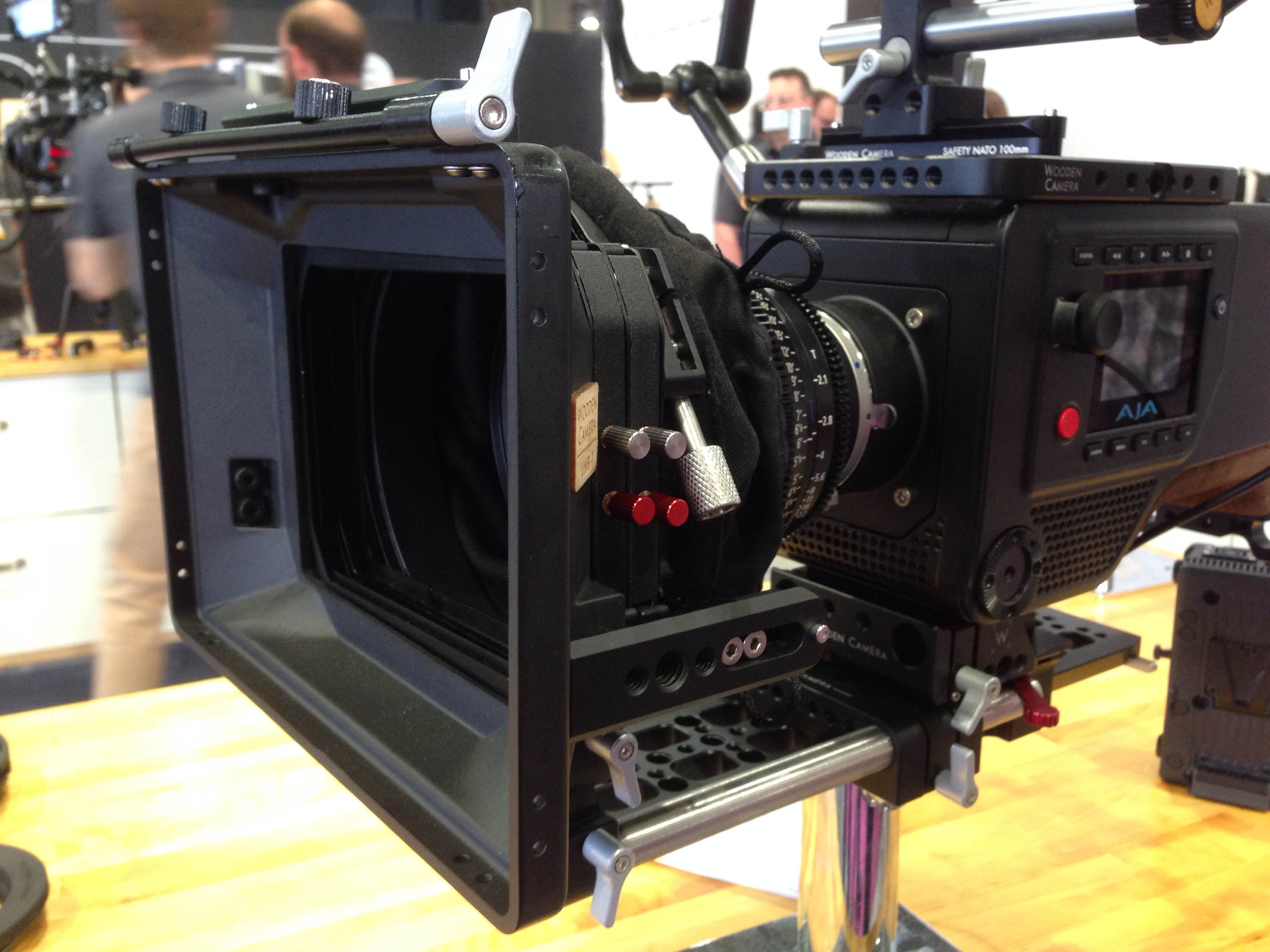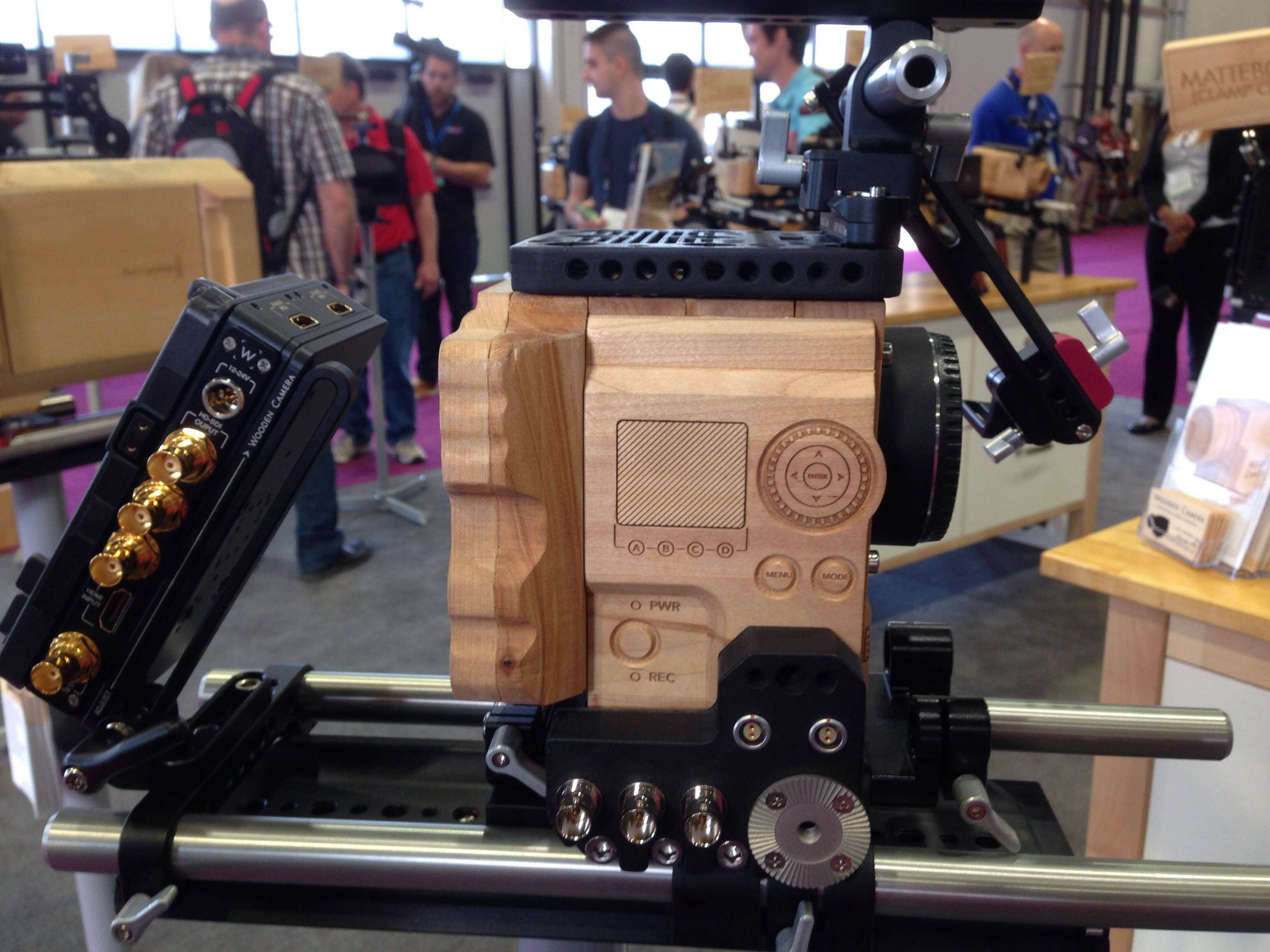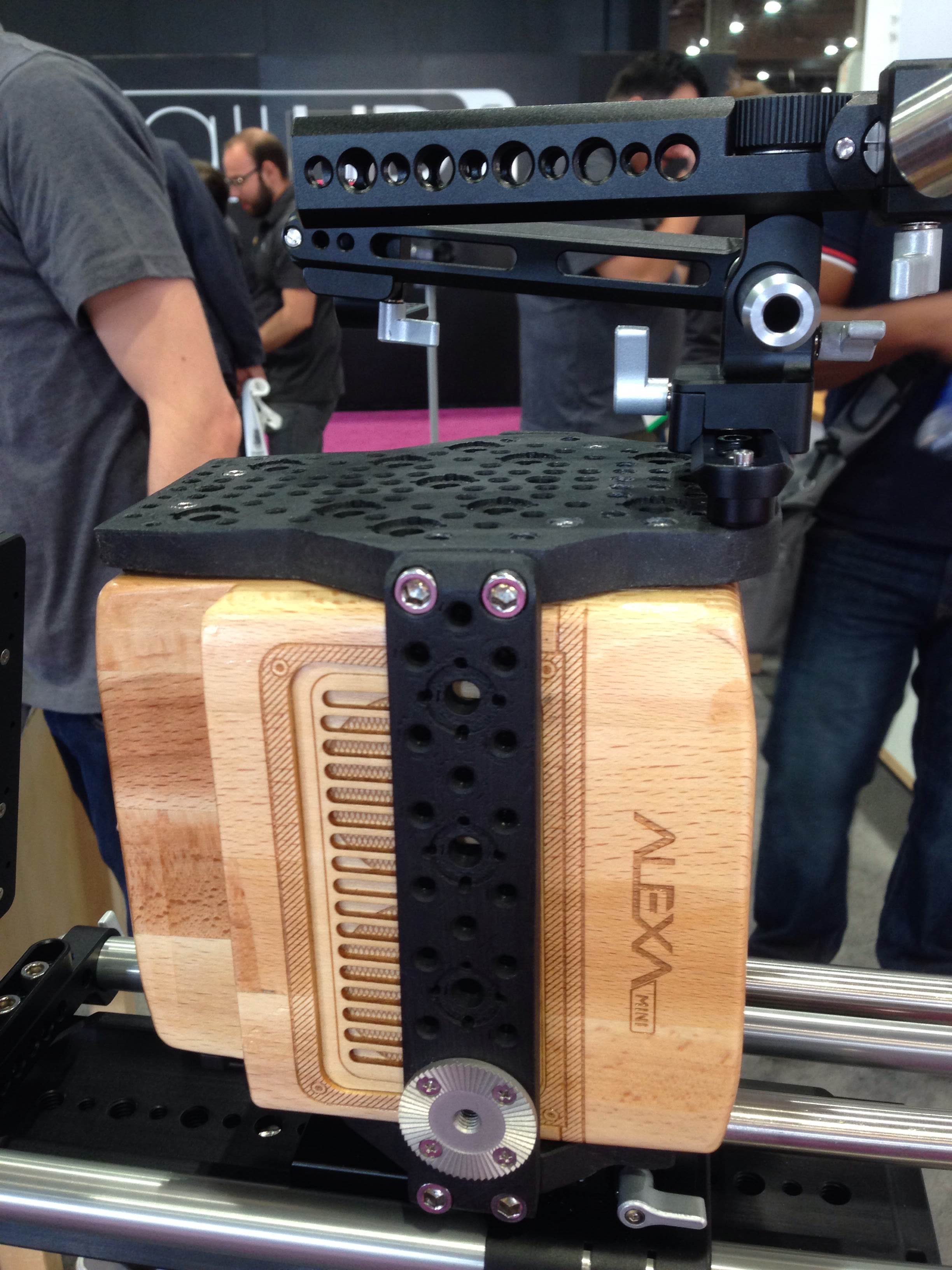 Wooden Camera was showing its new support rigs for the ARRI Alexa Mini and new RED Weapon cinema camera at NAB last week. Both rigs are at the prototype stage but we were told they are very close to the final design that will ship. The Arri Alexa Mini rig will be comprised of a cage with lots of 1/4 20 and 3/8 mounting holes for accessories and Arri rosettes on the sides. There will be a quick release system that allows you to quickly separate your camera from your rods and a sliding ARRI style dovetail plate for rapid attachment to a tripod.