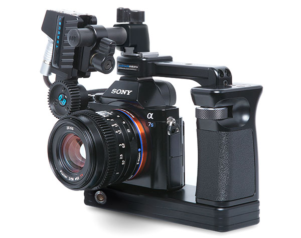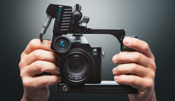 The ultraCage Scout offers a very compact electronic follow focus system for small camera such as the Sony a7S and Panasonic GH4. The rig will also accommodate DSLR cameras like the Canon 5D Mark III, but it will not not fit taller DSLRs such as the Canon 1D C and Nikon D4s.