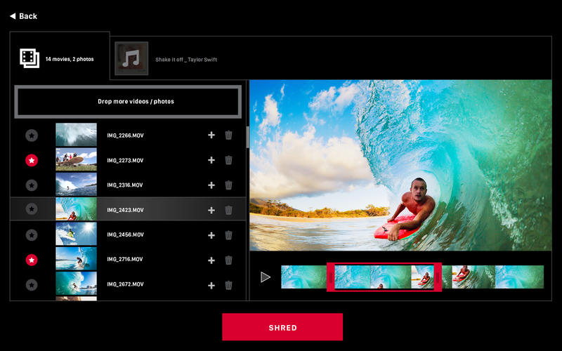 Import any amount of videos and photos from any source: your GoPro, iPhoto library, memory card, or hard drive. Shred Video will analyze your videos to find your best action moments, and make sure everything is properly edited into the final cut.