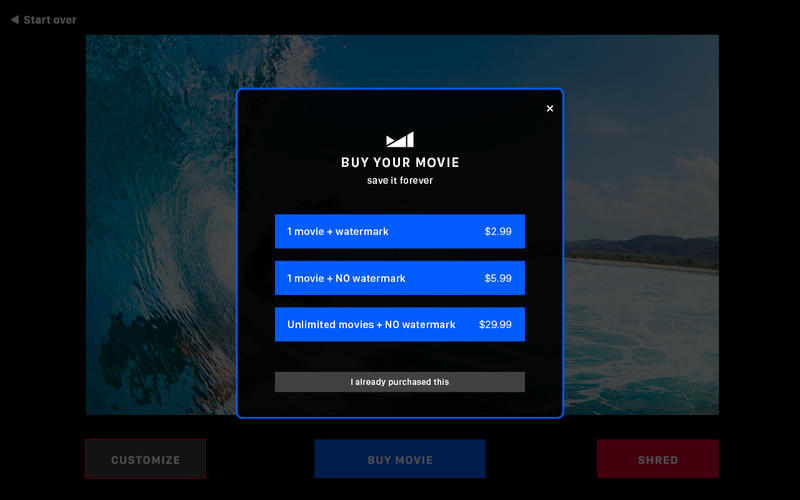 You only pay for Shred Video if you love the movies we help you produce. Buying your movies allows you save them forever, to store and share on whatever platforms you choose. There are three payment methods: