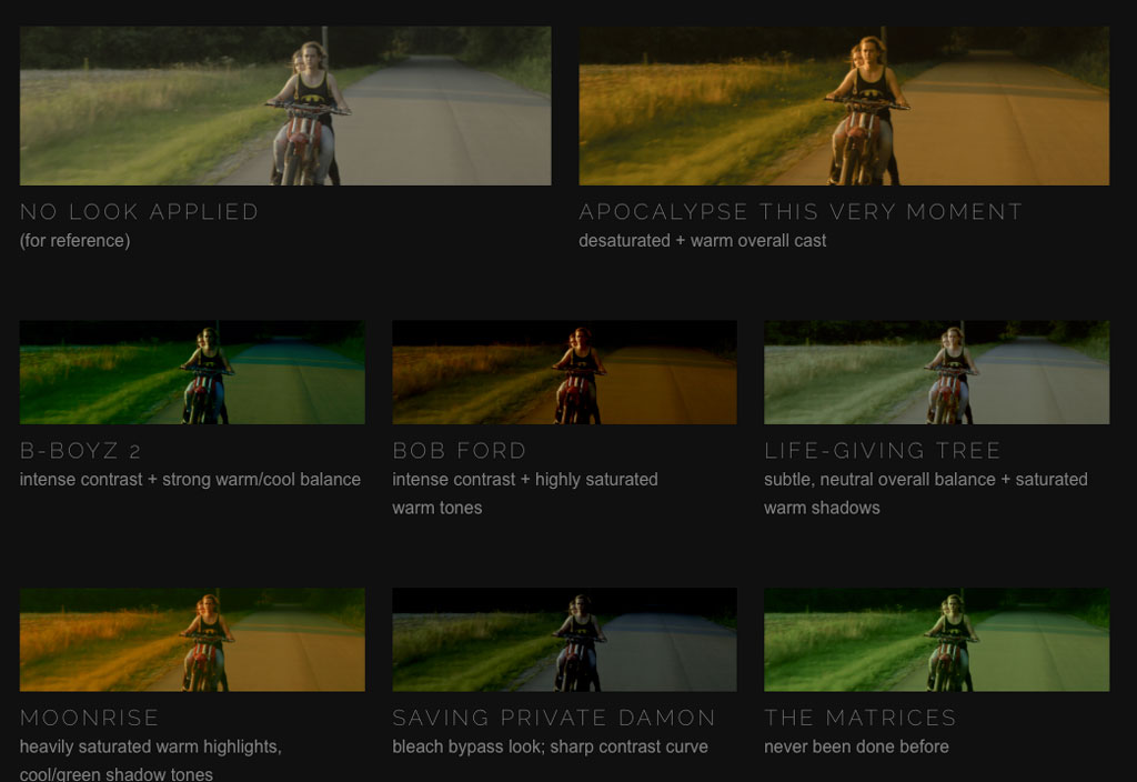 Provided in a small downloadable .zip file, the color grades come in the form of 3D LUT files (3D “lookup tables”) originally designed in DaVinci Resolve. Visually iconic films such as Apocalypse Now, Saving Private Ryan, The Matrix, and Moonrise Kingdom are among the seven free color grades.