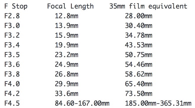 Fixed lens cameras are a balance between focal range, convenience and optical quality. The LEICA DICOMAR lens on this camera is definitely a compromise between the three. The lens has a variable aperture of F2.8 to F4.5, depending on the focal length. Unfortunately the lens only stays at F2.8 at the very wide end of the focal range. As you zoom in the lens aperture ramps almost instantly, and it isn’t until you go beyond 84.6mm (185mm in full frame 35mm film equivalent) that it remains constant at a rather slow F4.5. Below is a list of focal ranges where the aperture value changes on the lens: