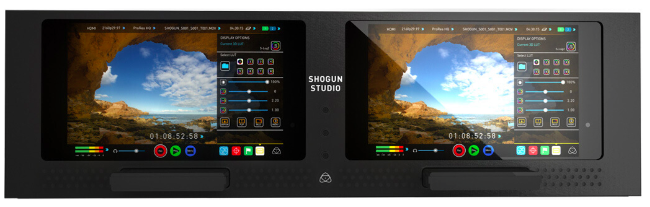 The dual 7″ calibrated SuperAtom IPS monitors allows for collaboration on set, have built in scopes for shot setup and 4K to HD down scaling for connection with existing HD infrastructure or multi resolution master/proxy recording. From a control perspective, the Shogun Studio features 9 pin Sony RS422 machine control, AMP over Ethernet or start/stop trigger over both HDMI and SDI.