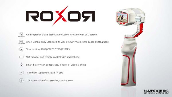 FilmPower, the Chinese company who made the popular Nebula 4000 Lite handheld brushless gimbal, have announced a new integrated 4K camera and brushless gimbal called the ROXOR. The idea of the ROXOR is to produce a combined camera and 3-axis stabiliser with a more streamlined form factor. In that respect it is similar to that of the recently launched DJI OSMO – the most obvious competing product.