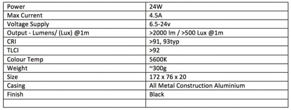 The prototype of the light I saw had very good colour accuracy when measured using a Sekonic C-700 SpectroMaster Light Meter. We recorded the CRI Ra above 95. This finding is re-enforced by Blindspot’s own published data using the Television Lighting Consistancy Index (TLCI) test devised by former BBC tester Alan Roberts. The the prototype scored 92 which places it towards the top of the charts for accuracy.