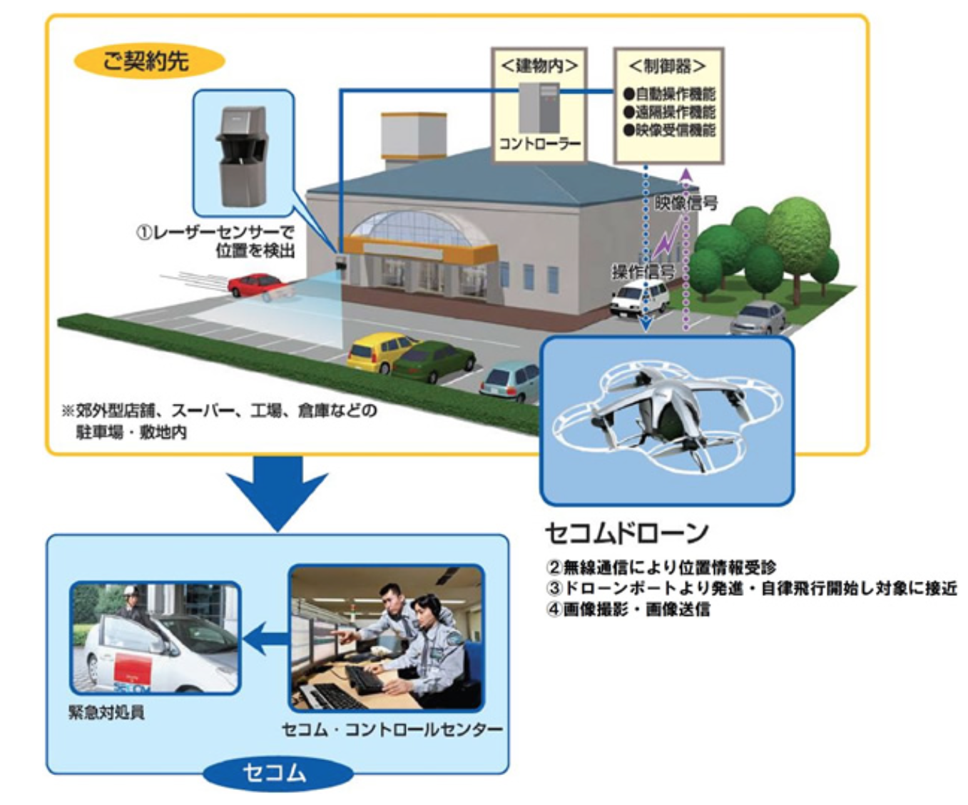 A revised aviation law which took effect yesterday in Japan has allowed Secom to start the service with the approval of the transport ministry. Secom will be offering the drone service to companies running large-scale factories and commercial facilities. The Secom drones cost around ¥864,000 ($7,000US), and companies using it will pay a minimum monthly usage fee of ¥5,400 ($44US).