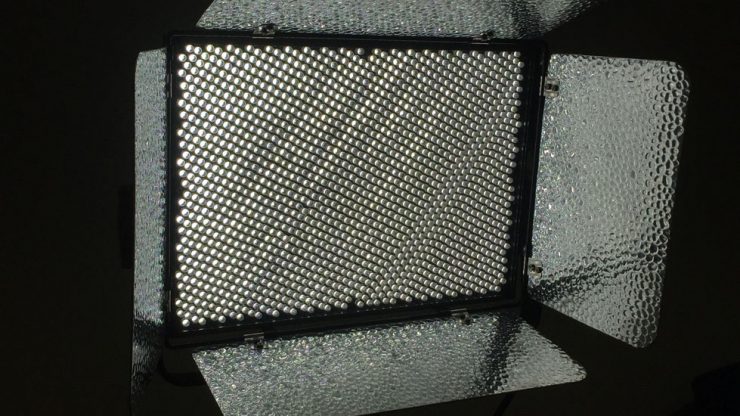 Opening the barn doors reveals the LEDs, which are packed together much closer than other LED lights I’ve seen. They’re arranged in a honeycomb pattern and Aputure say that this is what allows them to achieve the same output as a 1K lamp in a much smaller unit that only draws 120W of power.