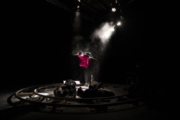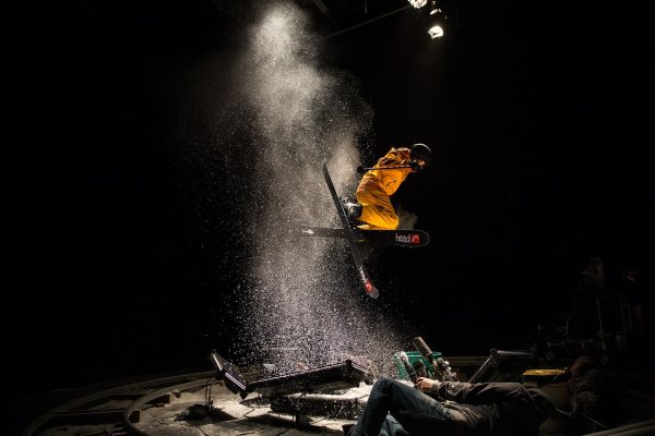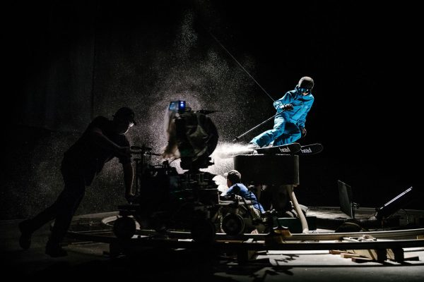 The most complicated effect was getting the snow to seemingly push away and blow out from the edge of the skis in the video of the carve. We actually lifted the track 4 inches, ran hoses underneath (which the dolly push had to jump as he went around!) that went into the pedestal. The crewmember hidden inside the pedestal directed the flow of snow, while two other people fed the shop vacs outside the curtain and another person was on the ground below the pedestal shooting ambient snow into the air.