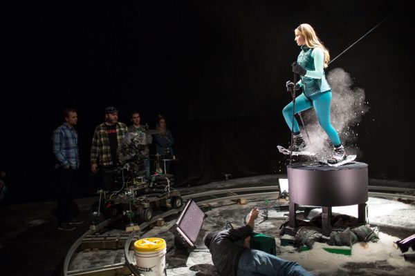 To achieve the sense that the athletes were frozen in the midst of a thrilling moment, we had to suspend them all with thin wires that were attached to the roof of the studio. The actors all wore vests with multiple pick points that allowed the rigging crew to lift them from different areas to achieve the most natural body position for the action they were representing. In the case of the skier performing a carve and the person snowshoeing, we put them on a pedestal and rigged them at an angle to help them lean into their movements.