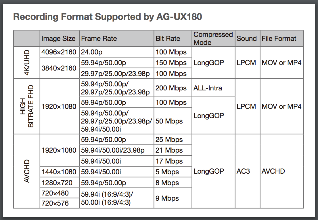 The cameras have dual SD card slots and record in your choice of Quicktime MOV, MP4, and AVCHD files, and the UX180 can simultaneously record UHD on one card and lightweight 1080 on the other and you can apparently send in your files straight from the camera.