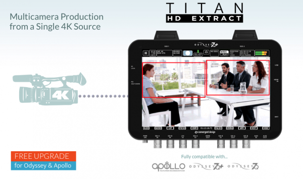 Titan HD Extract allows you to create multi-camera productions from a single 4K/UHD camera. Titan records three HD streams from a single 4K/UHD source (HDMI or SDI). Titan records one HD downscale of the entire 4K raster and two HD extracts based on user-defined movable windows (within the 4K image). This is a really clever feature and one that I constantly use on a lot of my shoots. Titan HD Extract was originally $795 US and it’s impressive to see Convergent Design now include this as a free feature for all new and existing Odyssey7Q/7Q+ and Apollo owners.
