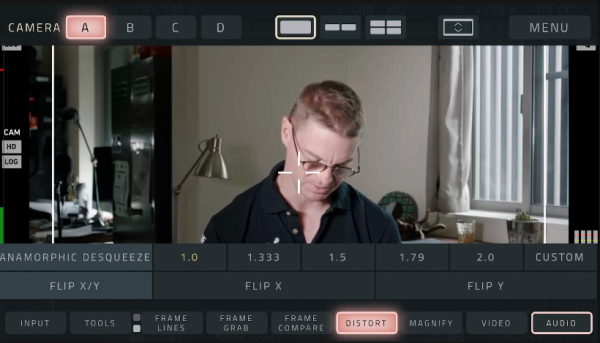 By adding the same camera to viewing inputs A, B, C and D you can then customise them with various monitoring tools and look at each one individually or all of them at once. As an example you can have a Log image on input A, the same image with a LUT on input B, the image with false colour on input C, and the image with a waveform on input D.