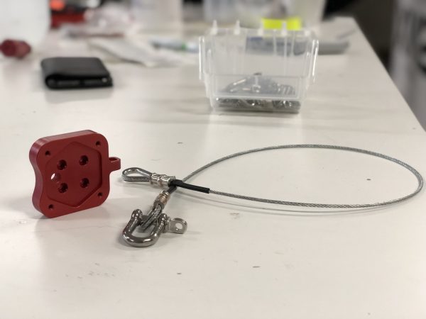 A safety wire can be purchased together with the Thingymajig, available in three lengths. It features a D-Shackle on one end and an eyelet on the other.