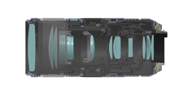 The optical construction of the lens consists of (20 elements in 14 groups), and it uses three LD (Low Dispersion) lens elements to effectively compensate for axial and transverse chromatic aberrations.