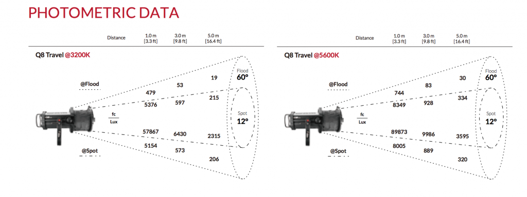 Fiilex claims that the Q8 can output 8349lx (744fc) in the full flood position when used at 5600K at a distance of 1m (3.3ft). In the lights full spot position it’s claimed to output 89873lx (8005fc) at 5600K at the same distance. Just as a comparison the Rayzr7 300D (this fixture is only 5600K) puts out 25700lx (2380fc) in the full flood position at a distance of 1m (3.3ft). The Aputure 300d (also a 5600K only light) puts out 8390lx (829fc) in the full flood position at a distance of 1m (3.3ft).