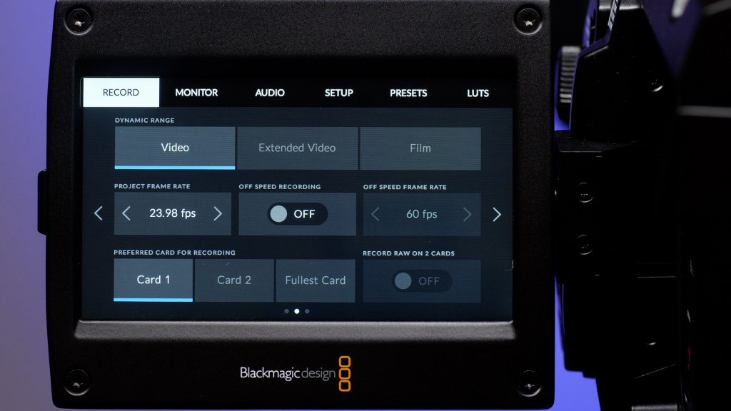 For the SD card fan, the URSA Broadcast camera can record in UHD ProRes HQ at 60p. I wish other cameras could do this as well. ProRes edits super easy on practically all modern computers. SD cards can also be used for storing and loading LUTs and Presets. To record to the SD Cards or CFast cards a simple switch is used inside the LCD compartment just above the media slots.