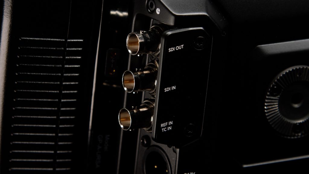 On the back, you have a 12G-SDI Out for a monitor or recorder as well as a 12G-SDI In, LANC, Genlock, Reference, Timecode in a headphone jack and 12V power input.