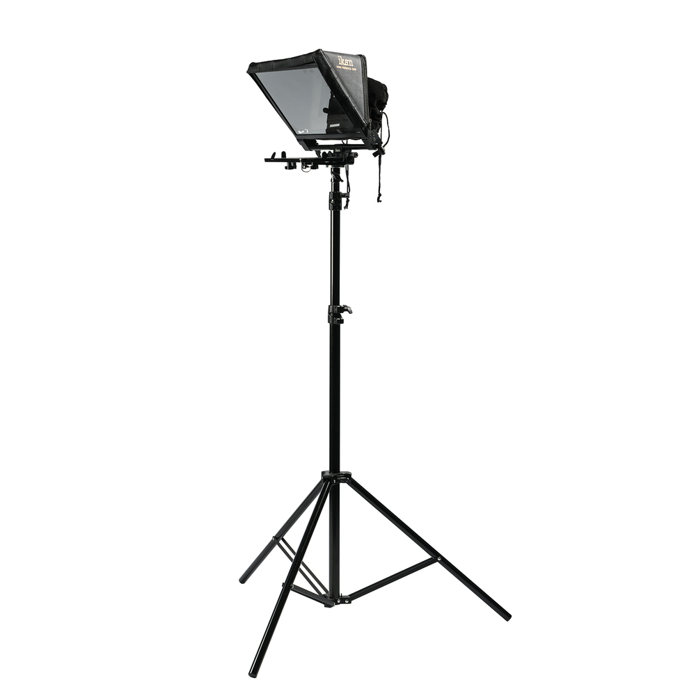 The PT-ELITE-LS is a lightweight teleprompter that can be mounted on a light stand. It uses American-made 70/30 beam splitter glass with an adjustable frame. There are no specifications on the size of the monitor that can be mounted. This looks to be a nice affordable option for anyone looking for a simple teleprompter set up.