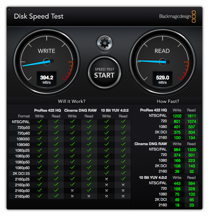 Using the Angelbird Dual Card reader with Thunderbolt 3 on my iMac and the Blackmagic Design Disk Speed Test software, the Angelbird CFast media is pretty fast with a WRITE speed of 394.2 MB/s and READ at 529 MB/s.