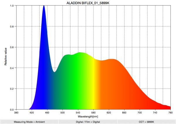 Lets now compare that against the very good Aladdin Bi-Flex 2×1. Above you can see the spectral distribution when that light is set at 5600K. As you can see the Aladdin has a much fuller colour spectrum and doesn’t have a big gap at around 480nm.