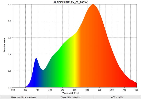 Again lets now compare that against the Aladdin Bi-Flex 2×1. Above you can see the spectral distribution when that light is set at 3000K. As you can see the Aladdin has a much more linear spectral distribution despite the DP Lumi having a slightly fuller spectrum.