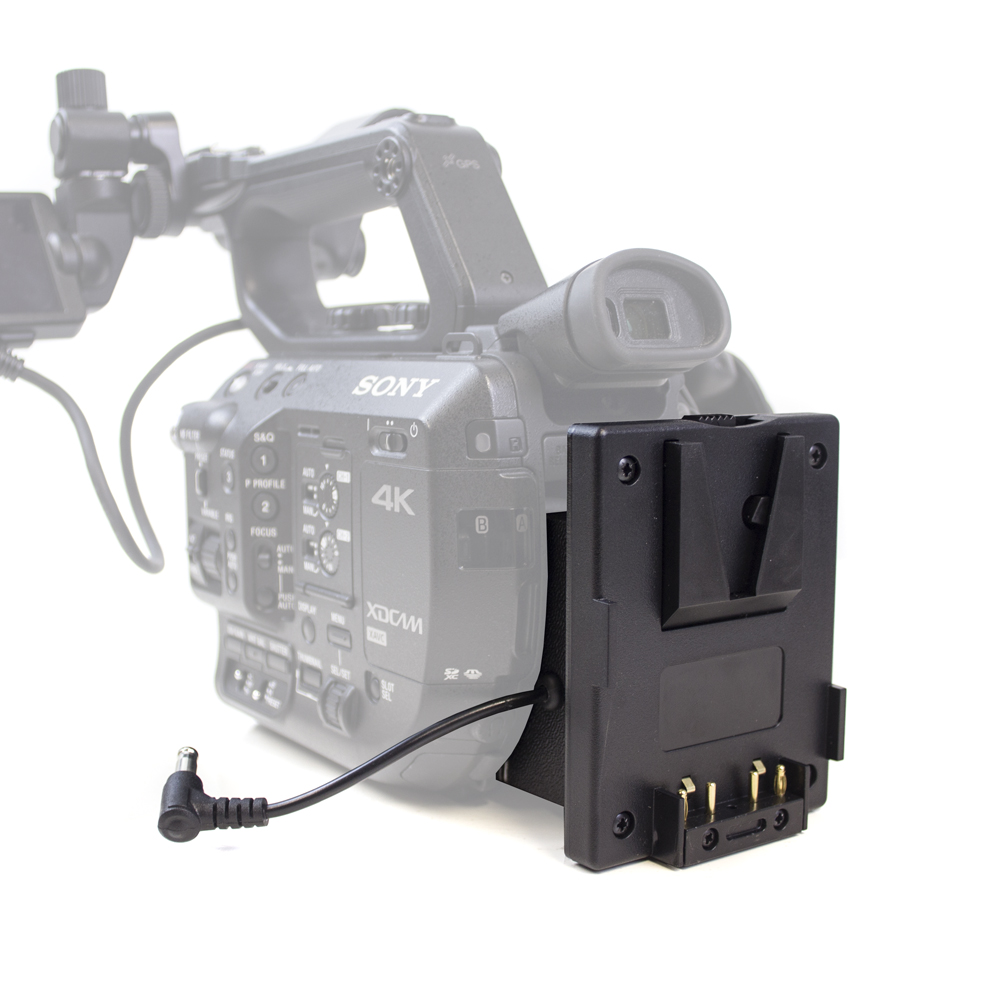The plate fits into the original battery port of the Sony FS5 via a mechanical BPU battery fitting and connects to the camera via a fixed Sony EX flying lead.