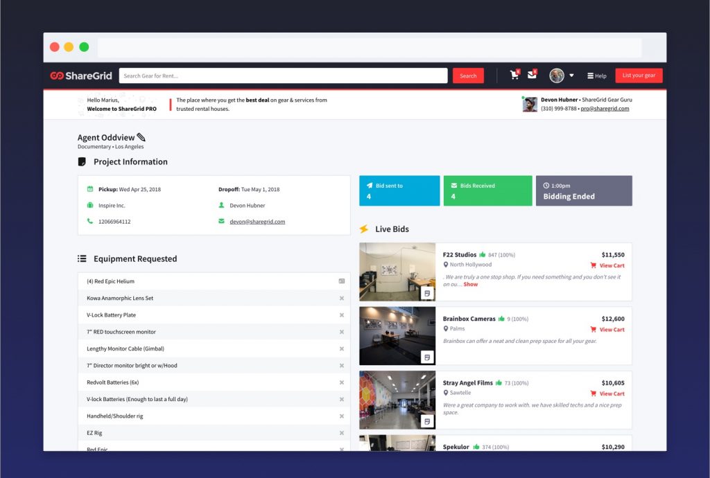 Project managers are able to submit gear requests which turn into a project dashboard to manage returned bids, inquire with rental agents, update requests and book the gear. On payment, you can even add-on insurance cover.