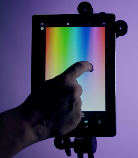 In the RGB Color Mode, any color on the color wheel can be selected with 1° increments. Saturation can also be controlled to mix the desired color with white light. By using the free iOS/Android app, colors can be sampled with an eye-dropper and communicated to the Timpani via Bluetooth at a distance of up to 30′ (9.14 m) away. The eyedropper feature can be used to match any color within an image or a video. This is very similar to what Aperture was showing us at NAB with their RGBW prototype light that was also using a color picker.