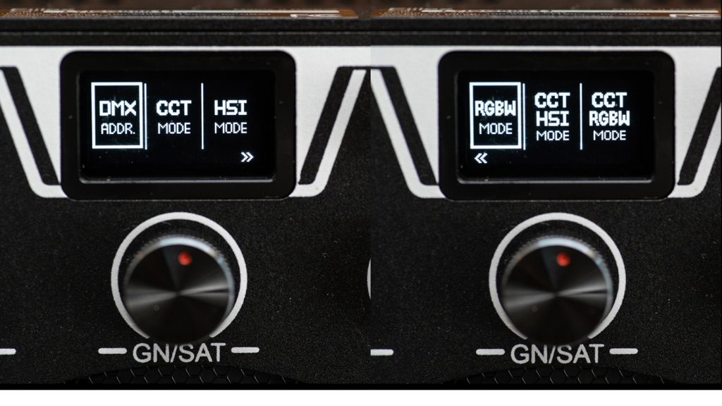 HSI MODE puts the Matrix II RGBW in full-color spectrum mode. To change the color, the CCT/HUE dial goes through the color spectrum in degrees from 0° to 360°. The GN/SAT is for changing the saturation and the INT dial (Intensity Control Knob) adjusts the brightness or output. Once you get used to the menu it’s very simple to control the fixture. I did notice the dials are very sensitive and move very quickly through the ranges. It’s a little tough to nail 5600K exactly on the first pass.