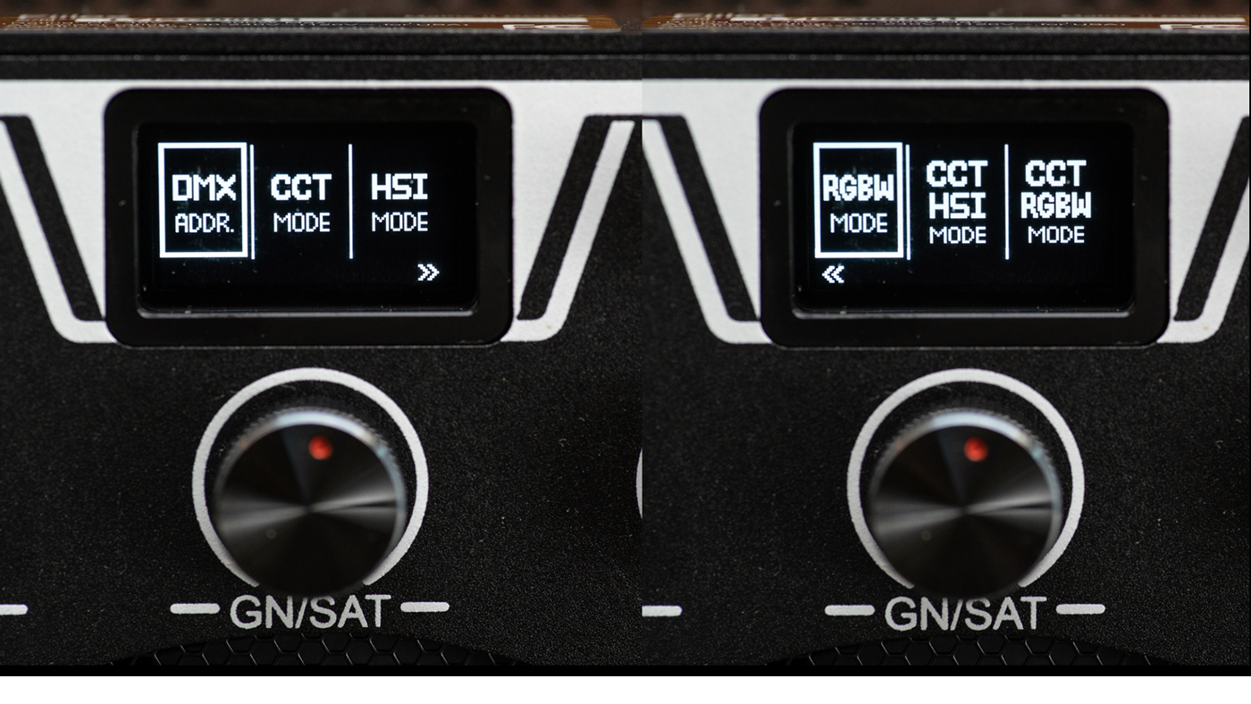 CCT MODE – To put the Matrix II RGBW in color temperature mode double tap the LOCK/MENU and select CCT MODE. Change the color temperature with the CCT/HUE dial for color temperatures from 2800K to 10,000K.