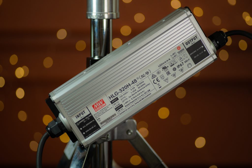 The fixture itself isn’t that heavy at 9.7 lbs (4.39 kg). The light requires a separate ballast and it also isn’t too heavy at 5.7 lbs (2.58kg). The ballast, however, has a very solid build and is fairly small and easy to work with. On the ballast, it states “Suitable for use in dry, damp and wet locations”. The AC and power cable that come off the ballast is pretty short.