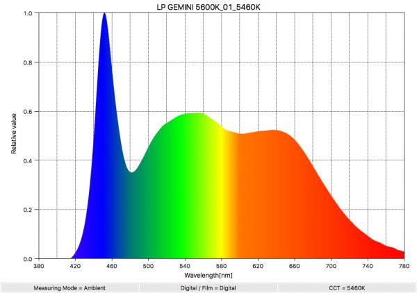 As a comparison, above you can see what the spectral response was for the Litepnales Gemini when it is used at 3200 K.