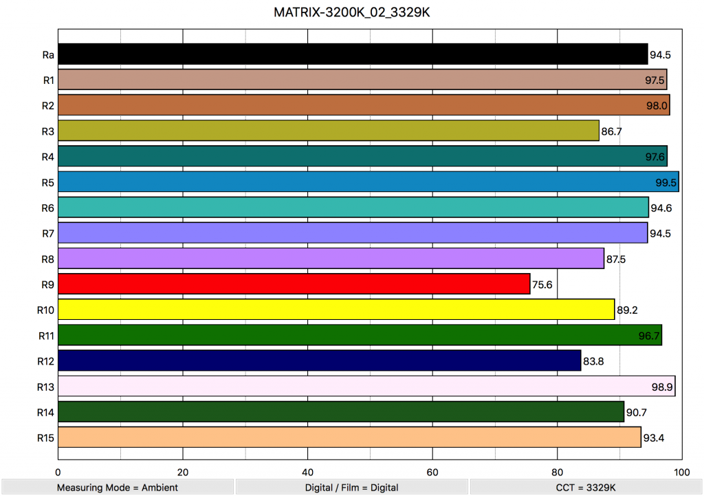 At 3200 K the light had a CRI (R1-R8) of 94.5 with an Extended CRI (R1-R15) of 92.28. These are pretty good scores. The scores for R13 (closest to caucasian skin tones) was 98.9, and the score for R15 (closest to Asian skin tones) was 93.4. These were excellent results. The only negative aspect of the scores was that the light only managed to score 75.6 for R9 (Red).