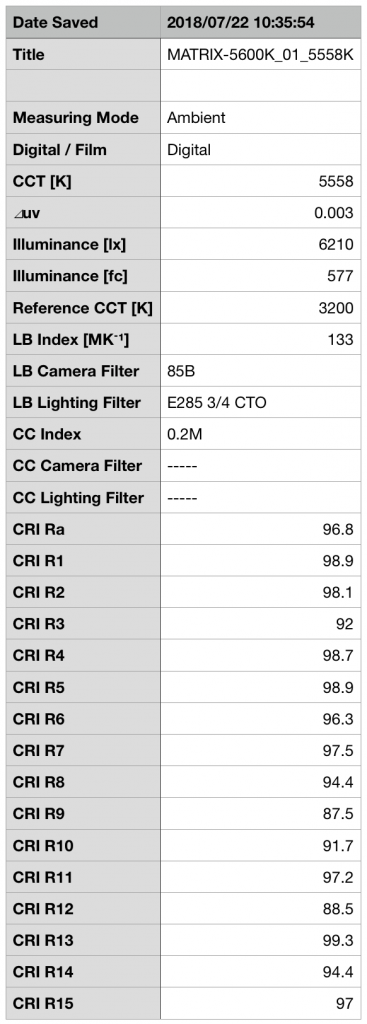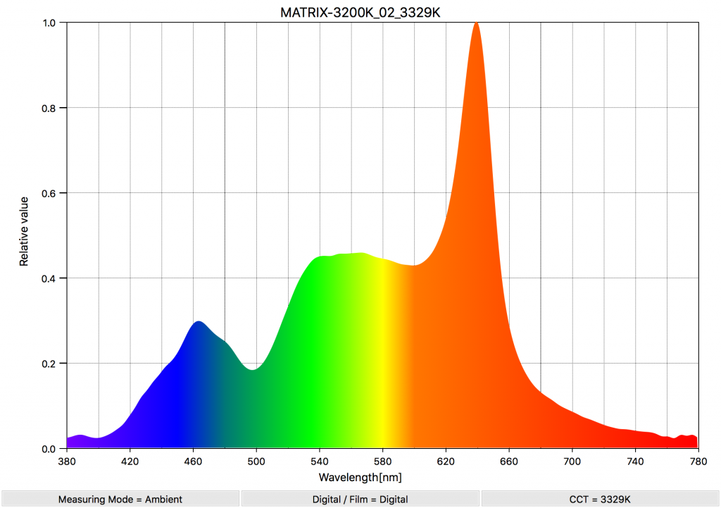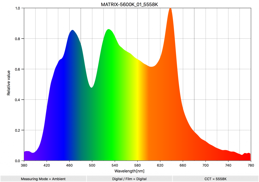 At 5600K the light only exhibits a slight very slight push towards magenta with a CC Index score of 0.2M. This is very good news for the Matrix II RGBW as color spikes make mix & matching fixtures on set a real pain in the butt. Now if those other fixtures have color spikes the Matrix II RGBW can join it by simply dialling in plus or minus green. Did I mention how much I like that?
