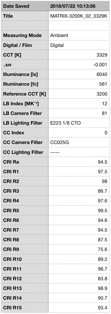 The output is fairly close with daylight 5600K having a tad more at 6210 Lux than the 6040 Lux it outputs at 3200K. Also worth mentioning is the actual Kelvin settings are very accurate. I’ve tested some fixtures that had a much larger discrepancy like 5600K actually reading closer to 6000K and higher.