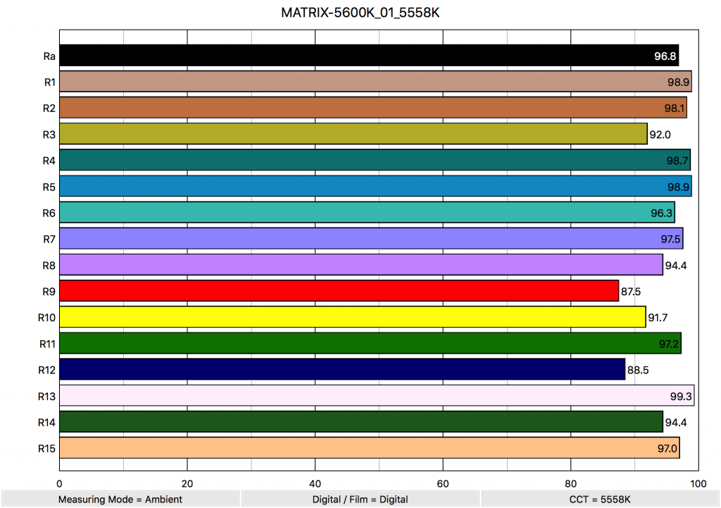 At 5600K the light recorded a CRI (R1-R8) of 96, and an Extended CRI of 95.33. These are very good scores. Again the R9 Red is a bit low at 87.5, however, that is better than the 75.6 it scored at 3200K. The scores for R13 (closest to caucasian skin tones) was 99.3, and the score for R15 (closest to Asian skin tones) was 97.0. These were excellent results.