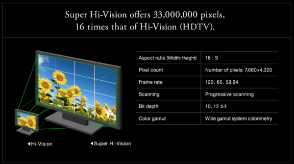 NHK’s 8K (well it’s actually 7680 x 4320) broadcasts will be available on a special channel between the hours of 10 am and 10 pm on a daily basis. The picture quality of the broadcasts will be 16 x greater than that of HD, and audio will be delivered in 22.2 multi-channel. NHK will be broadcasting in frame rates of 59.94, 60 and 120P.