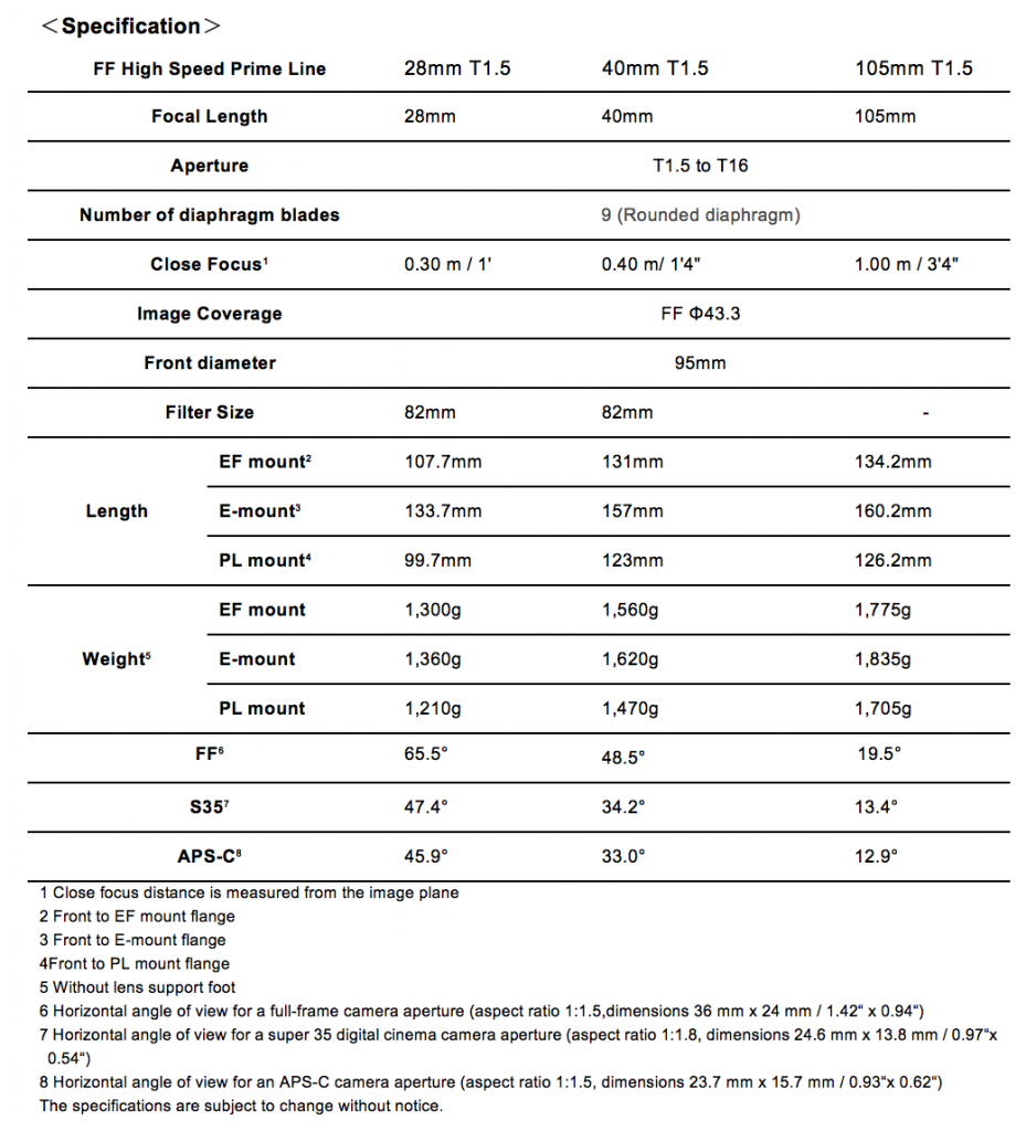 This brings the cine prime line to ten focal lengths all at T1.5 except for the 14mm & 135mm which are T2.