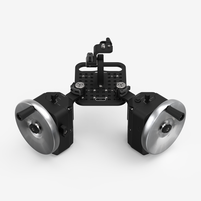 The wheel controller is based around a central cheese plate that the quick release mounts can be attached to. There is a large cutout for transporting the wheels and a top post with a mounting bracket for the MōVI Controller that uses the same quick release system.