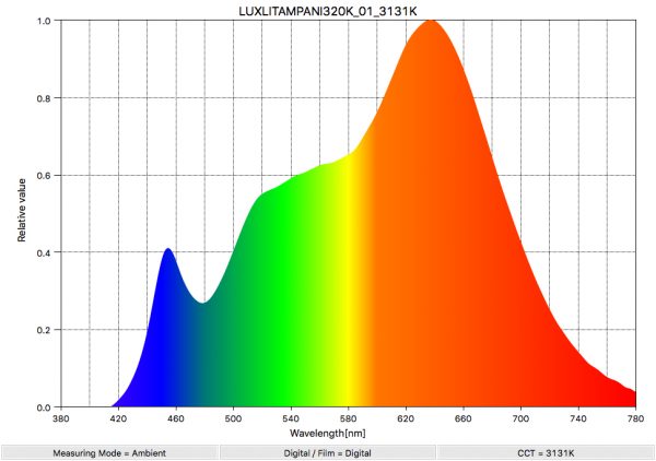 Just as a comparison lets look at the Luxli Timpani 1×1 RGBAW light that I recently reviewed. Above you can see its spectral distribution when used at 3200K. Its color spectrum isn’t as full as the Rotolight, but it is a bit more linear.