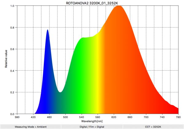 Above you can see the Rotolight Anova Pro 2’s spectral distribution when used at 3200K. While the light does have a nice full spectrum it certainly has a slight push towards green.
