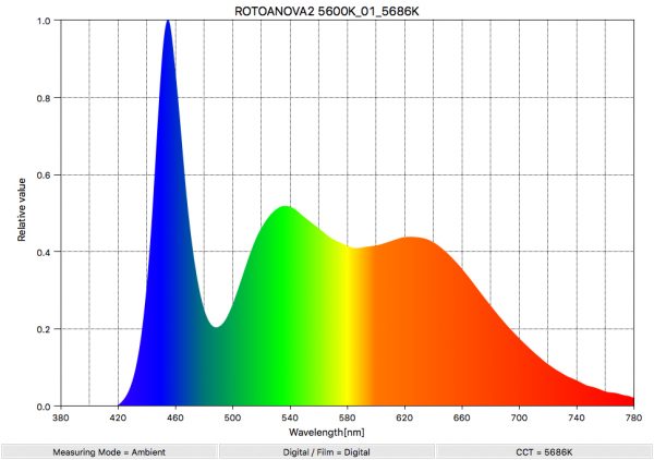 Above you can see the Rotolight Anova Pro 2’s spectral distribution when used at 5600K. The light has a push towards green as you can see.