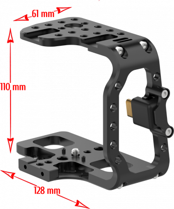 The stand-alone cage, has a half-cage design and has plenty of 1/4″-20 tapped holes, two cold shoe ports, anti-twist pins for the camera and a built-in 90-degree HDMI adaptor and clamp.