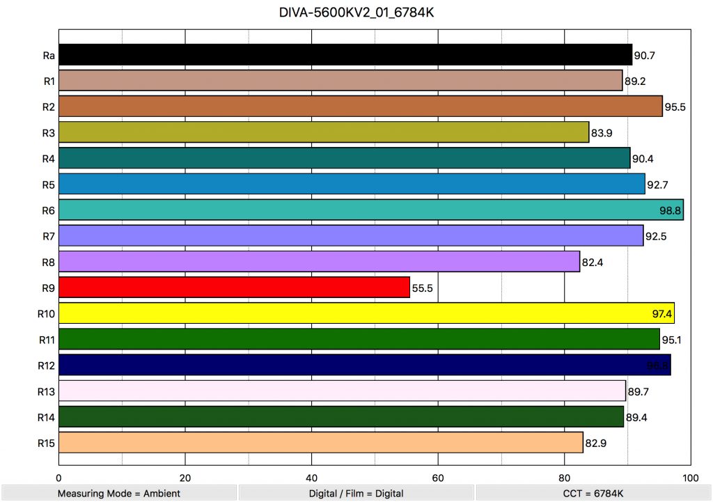 The average CRI is 90.7 with an extended CRI of 88.81. For the most part, a CRI rating under 90 these days isn’t very good and you can see a lot of lower saturation in several of the colors. The important skin tone colors of R13 89.7 and R15 82.9 aren’t so good.