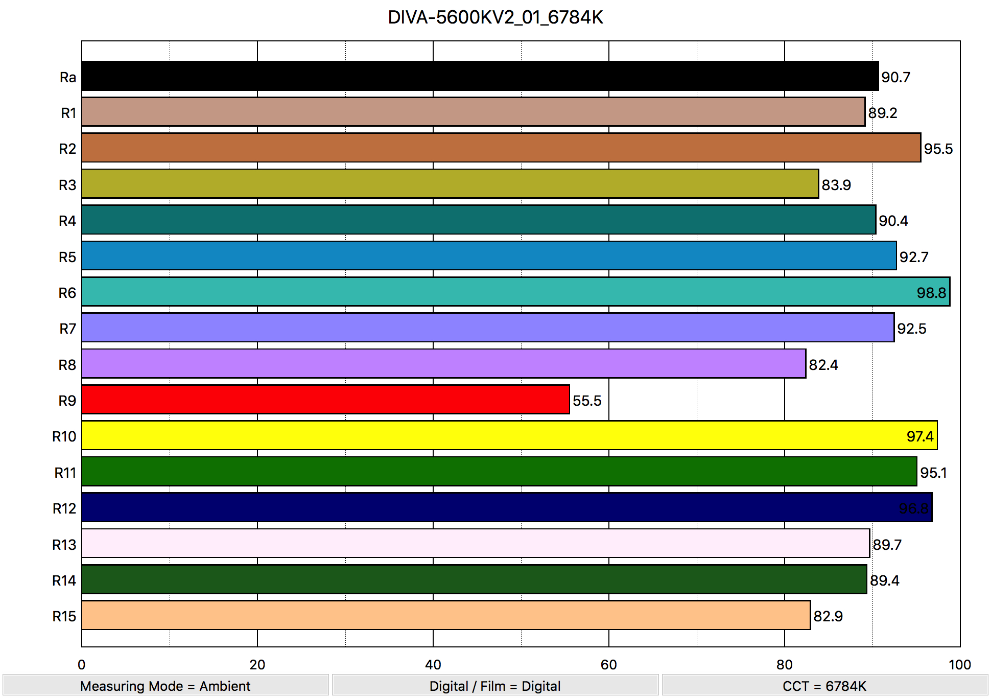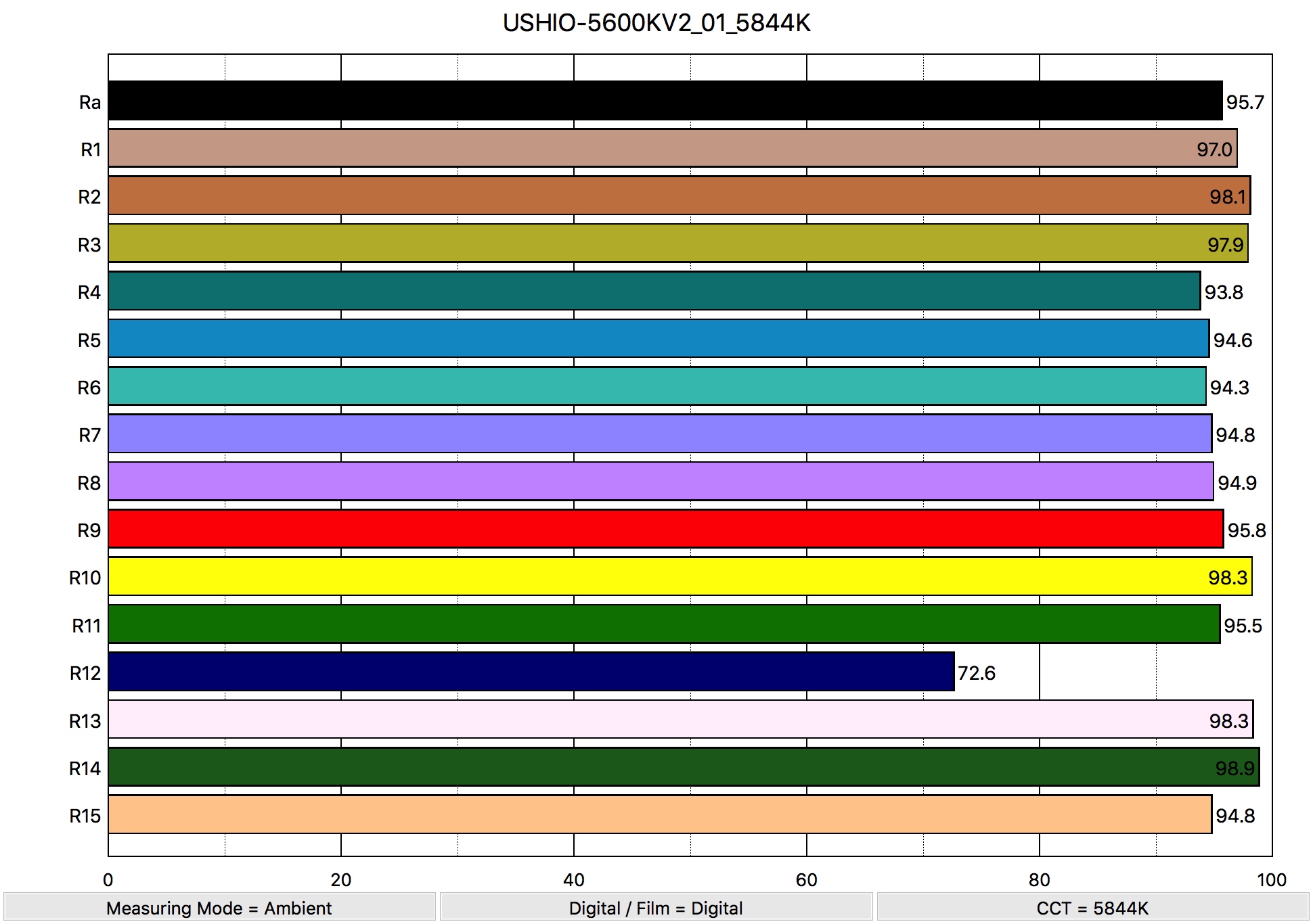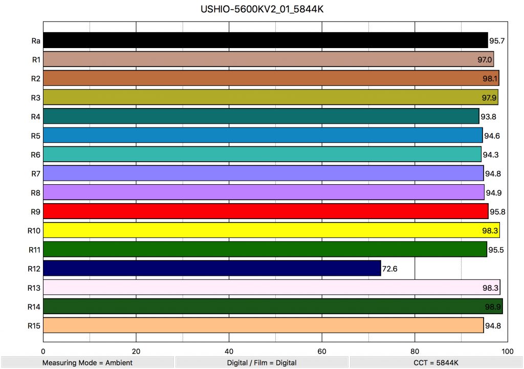 The average CRI is 95.7 with an extended CRI of 94.94. Not bad at all. Also, the important skin tones of R13 at 98.3 and R14 at 94.8 have nice scores.