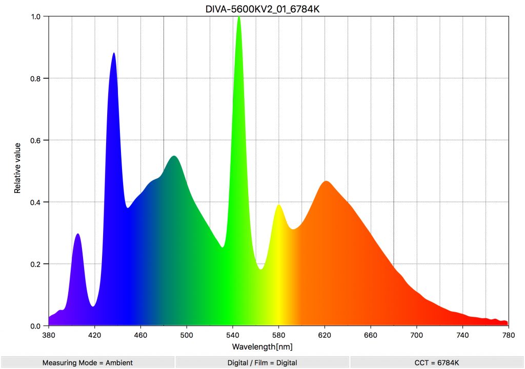 The Ushio ColourMax Spectral Distribution looks much better as well with a very slight green push and a normal blue spike that you will see in 5600K lights.